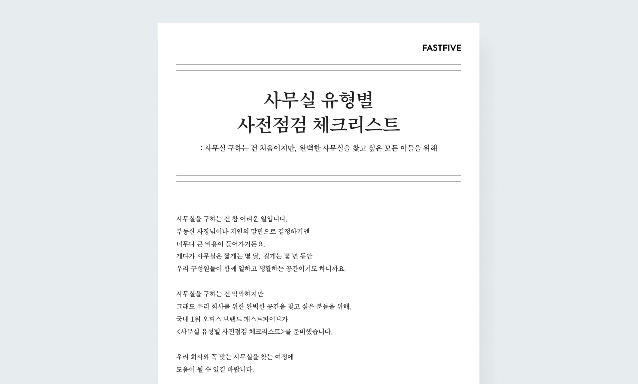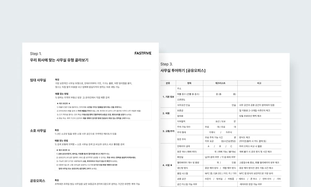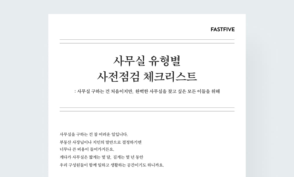 사무실을 구하는 건 막막하지만 그래도 우리 회사를 위한 완벽한 공간을 찾고 싶은 분들을 위해, 패스트파이브가 <사무실 유형별 사전점검 체크리스트>를 준비했습니다. 우리 회사와 꼭 맞는 사무실을 찾는 여정에 도움이 될 수 있길 바랍니다.