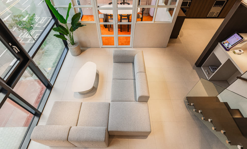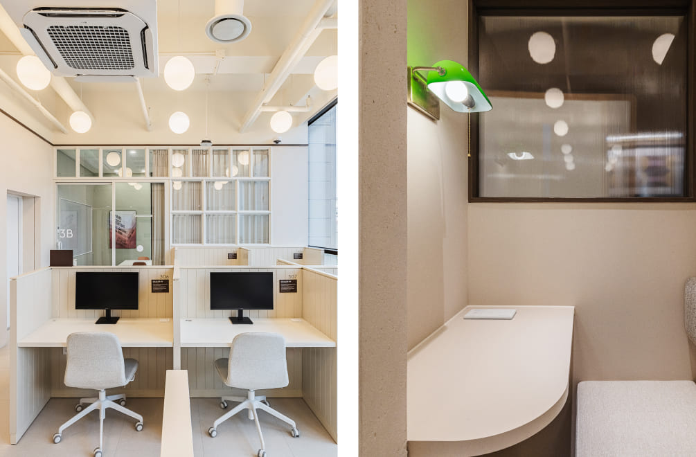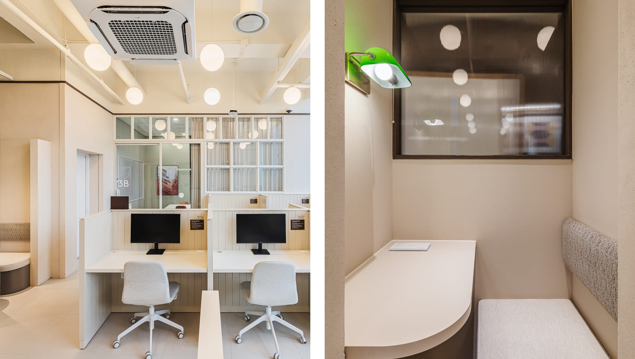 당산점은 들어서는 순간부터 '집'에 온 듯한 아늑함을 느낄 수 있습니다. 매트가 연상되는 타일의 디테일과 메일룸이 외출 후 집에 들어왔을 때 우편물을 확인하는 것처럼 친숙한 일상을 선사합니다. 이처럼 소소한 디테일이 더해져 당산점은 단순한 사무실이 아닌, 가장 익숙하고 편안한 '두 번째 집'이 됩니다.