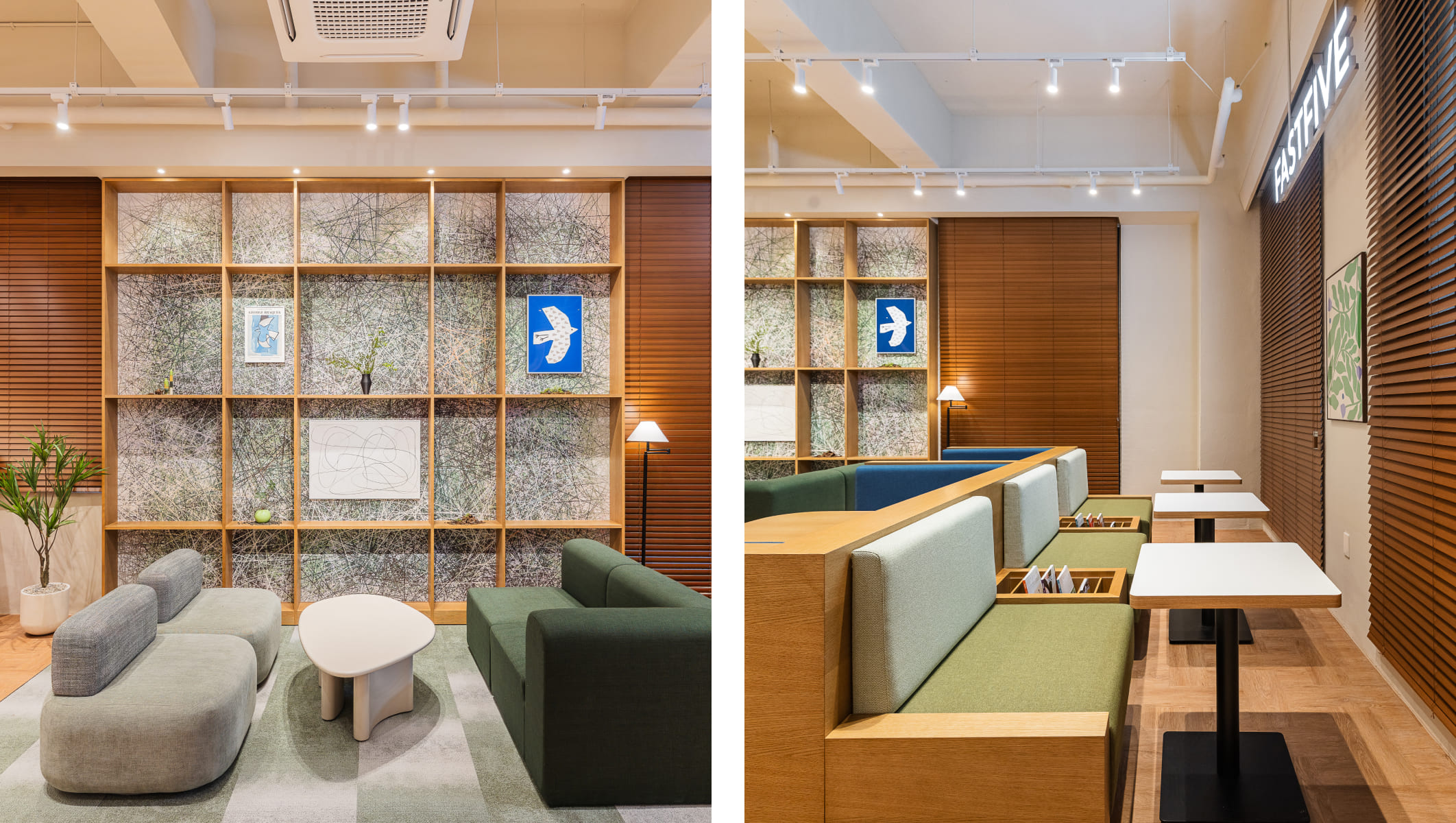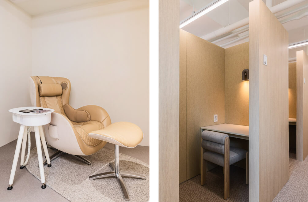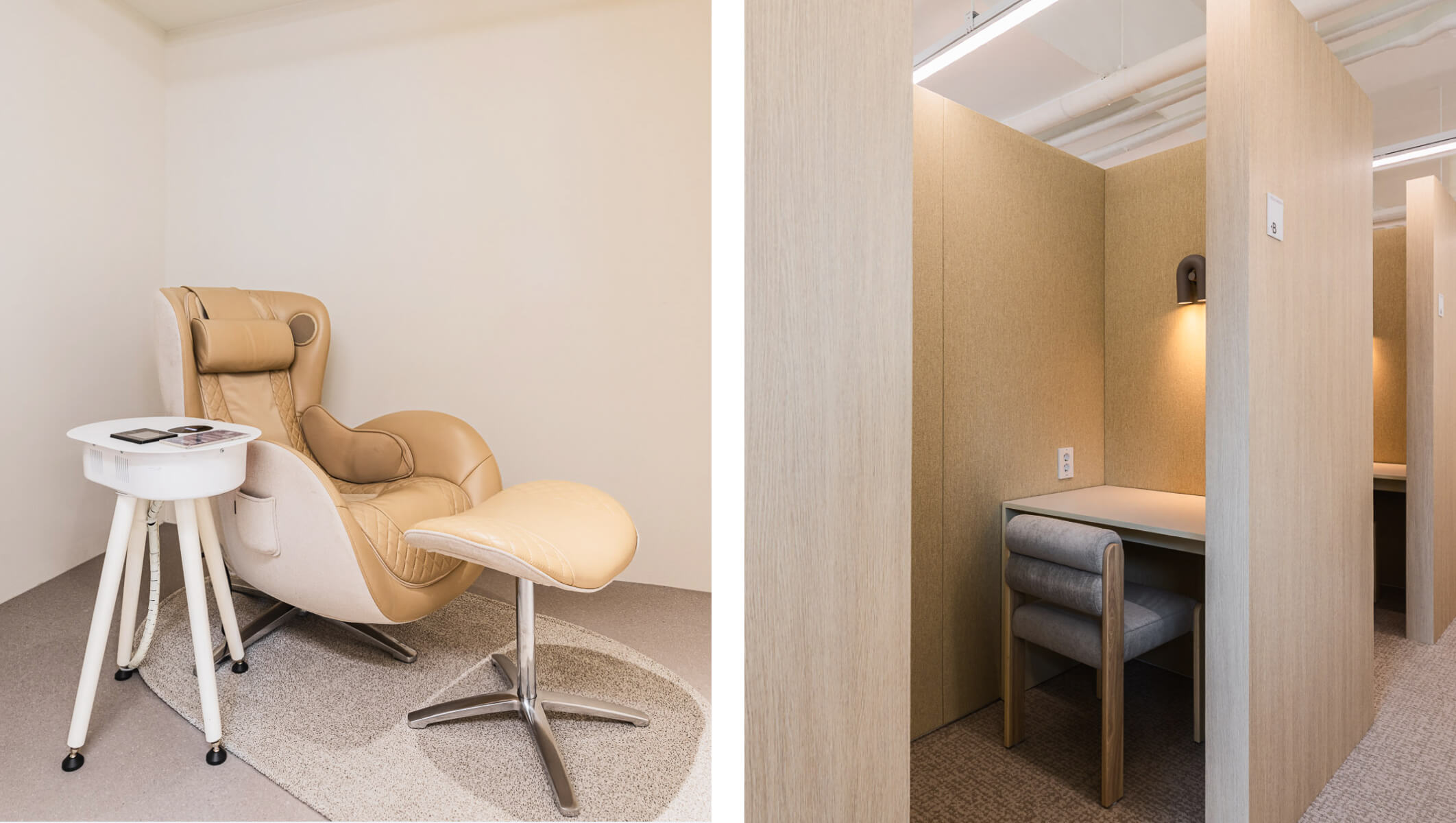 커튼까지 칠 수 있는 리차징 존부터 집중도를 높여주는 포커스부스까지 충분하게 준비되어 있죠. 급한 업무가 있을 때 틈틈이 들를 수 있는 마음 편한 공간입니다.